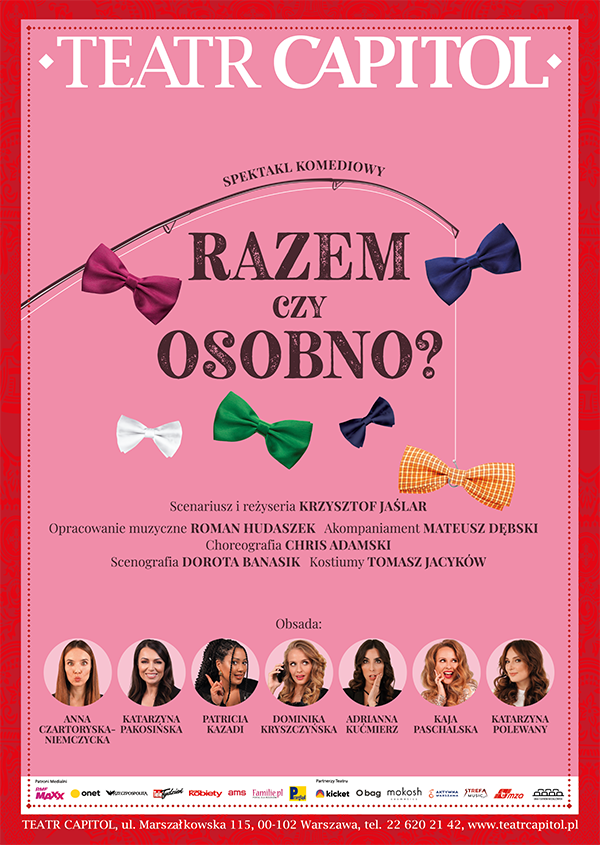 7 marca 2024 o godzinie: 19:00 zapraszamy na muzyczną, komediową nowość "Razem czy osobno?" w wykonaniu znanych i uwielbianych przez Widzów Aktorek, które śpiewająco zabiorą Was w świat skomplikowanych damsko - męskich relacji. Nie zabraknie wzruszeń, miłosnych historii, tańca i różańca, ale przede wszystkim nie zabraknie emocji i …śmiechu!… tak to jest, gdy ona jest z Wenus, a on… z kieleckiego! Prędzej czy później dopada nas dylemat stary jak świat - na miarę szekspirowskiego "Być albo nie być?" - i wydaje się nie do rozstrzygnięcia - Razem czy osobno? Znacie odpowiedź na to pytanie? Spróbujmy jej poszukać. Znaleźć mocne "za" i skonfrontować ze zdecydowanym "przeciw." Czy to w ogóle możliwe, by kochać kogoś aż po grób? Być razem przez całe życie? Czy to możliwe, by nie mieć ani razu ochoty trzasnąć drzwiami, wylogować się lub zmienić status na wolna/y? Razem czy osobno? Wybór jest trudny. Jak mówi klasyk, są plusy dodatnie i ujemne.W doborowym towarzystwie spróbujmy rozstrzygnąć ten odwieczny dylemat. A co tam! Otwórzmy tę puszkę Pandory. Może z pomocą przyjdzie… wino, które - jak twierdzą koneserzy - nie daje wprawdzie odpowiedzi, ale przynajmniej pomaga zapomnieć pytanie. Zapraszamy. Razem. Albo osobno."Przedstawienia nie polecamy nowożeńcom i świeżo zakochanym. Ale jak tylko minie Wam ten euforyczny okres, pamiętajcie o nas. Wpadajcie. Choćby w następnym tygodniu lub po kilku miesiącach " - mówi przewrotnie twórca spektaklu Krzysztof Jaślar. Do zobaczenia na rozśpiewanym i roztańczonym spektaklu "Razem czy osobno?"!