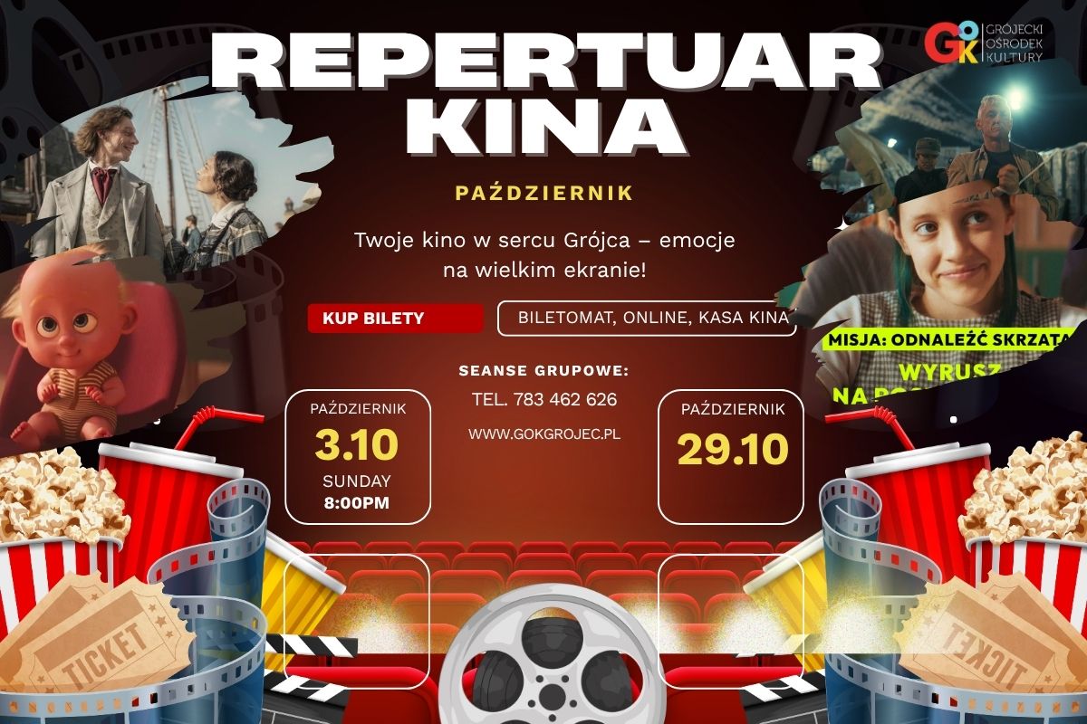 Ciekawy repertuar na październik, w którym każdy znajdzie coś dla siebie – od filmów familijnych, przez kino historyczne, aż po komedie i seanse tematyczne. Bilety można kupić wygodnie online na stronie biletyna.pl, w biletomacie w budynku GOK lub bezpośrednio w kasie kina na godzinę przed seansem. Nowością są Filmowe Środy – specjalne pokazy w środku tygodnia.