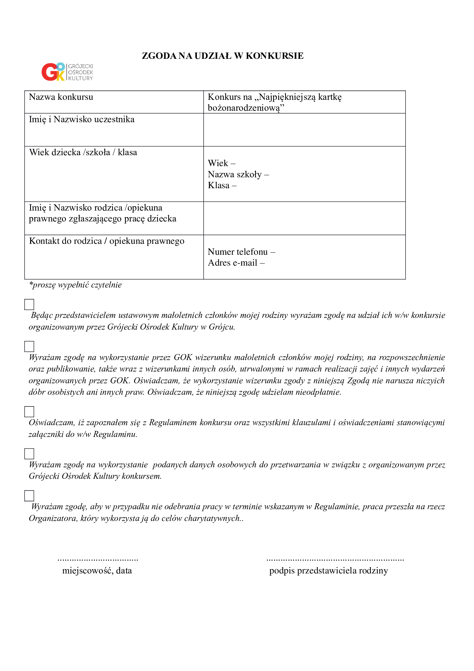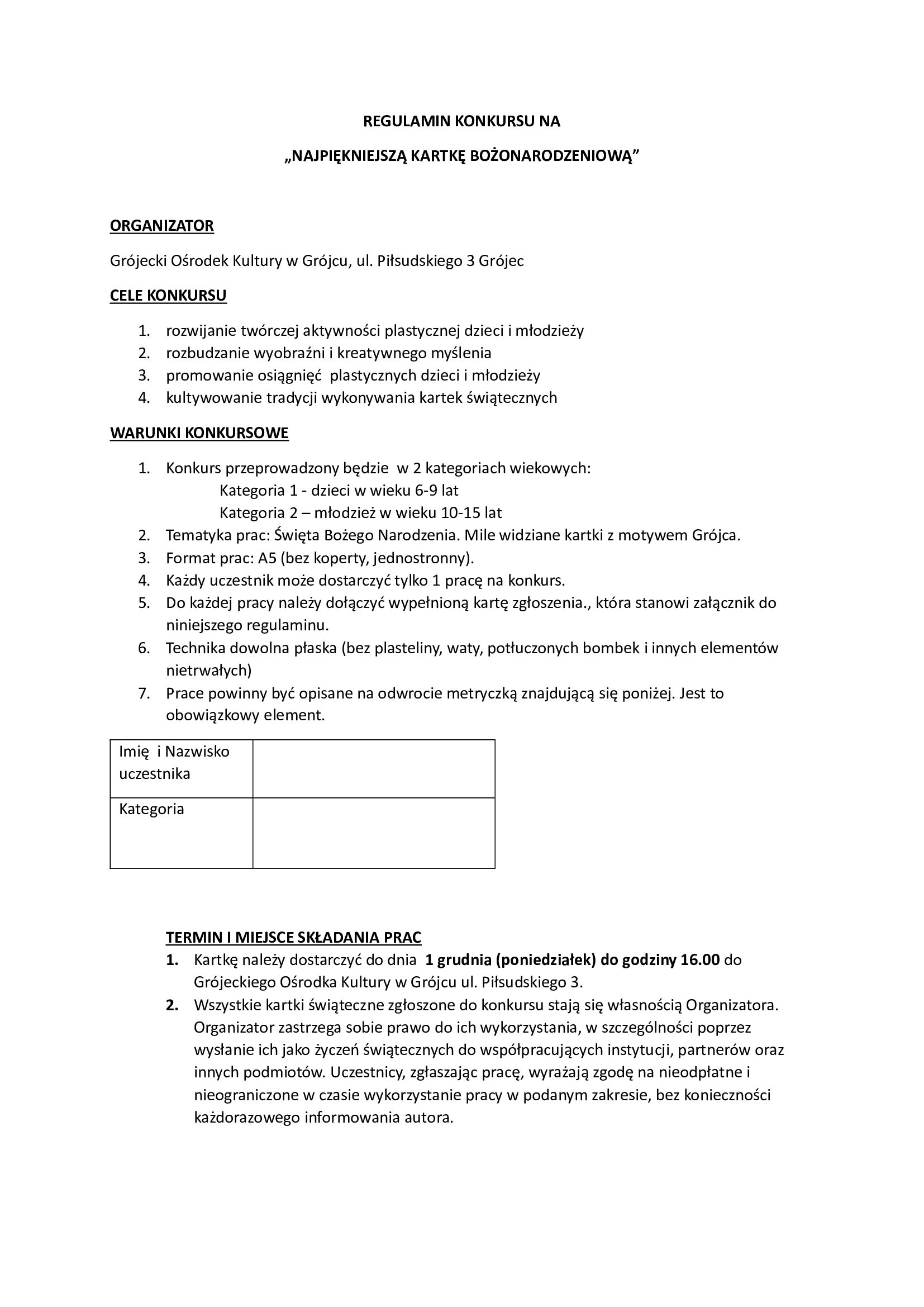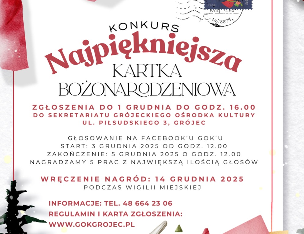Grójecki Ośrodek Kultury ma przyjemność ogłosić świąteczny konkurs plastyczny! Zapraszamy wszystkich młodych artystów do stworzenia własnej, niepowtarzalnej kartki bożonarodzeniowej! Pokażcie nam, jak pięknie widzicie święta! Szczegóły konkursu:
