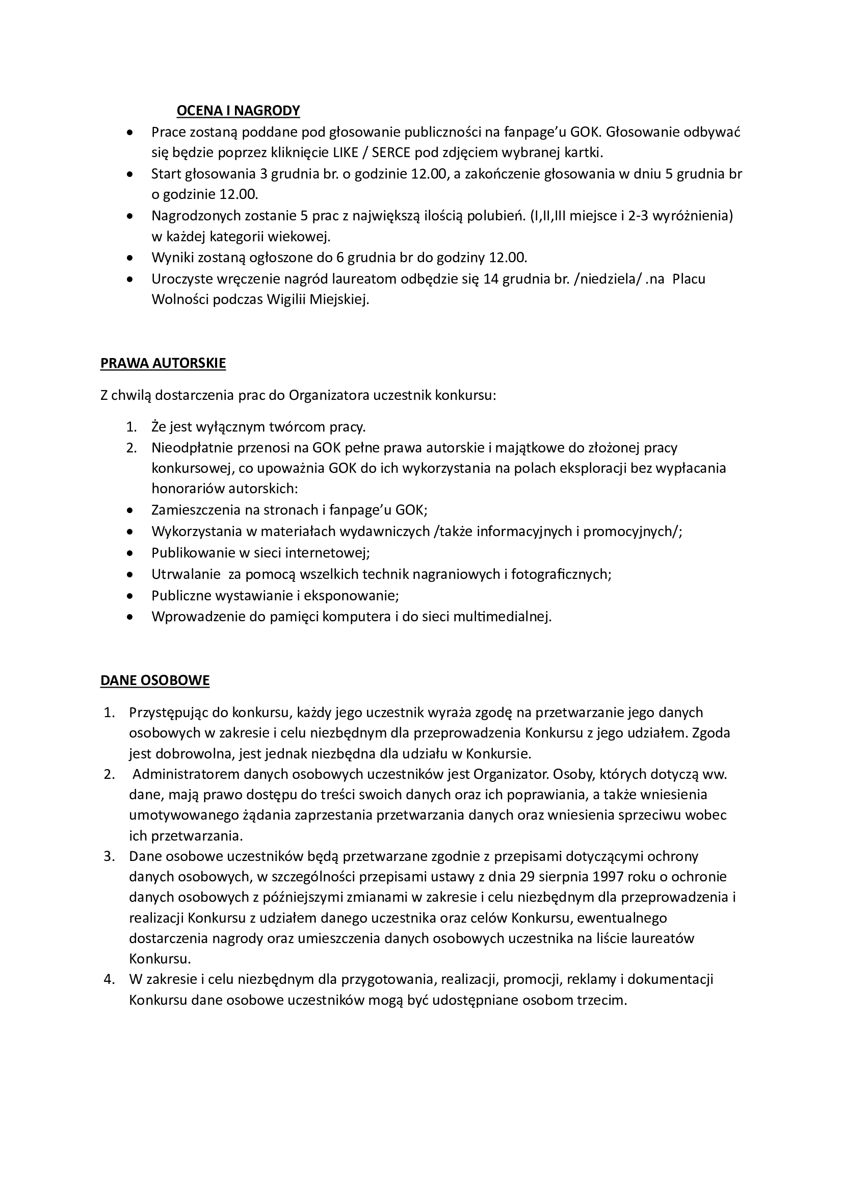 Termin zgłoszeń: do 1 grudnia (piątek) do godziny 16:00 Miejsce: Sekretariat Grójeckiego Ośrodka Kultury. Wasze prace będą walczyć o głosy publiczności w internetowym głosowaniu na naszym Facebooku w dwóch kategoriach wiekowych: