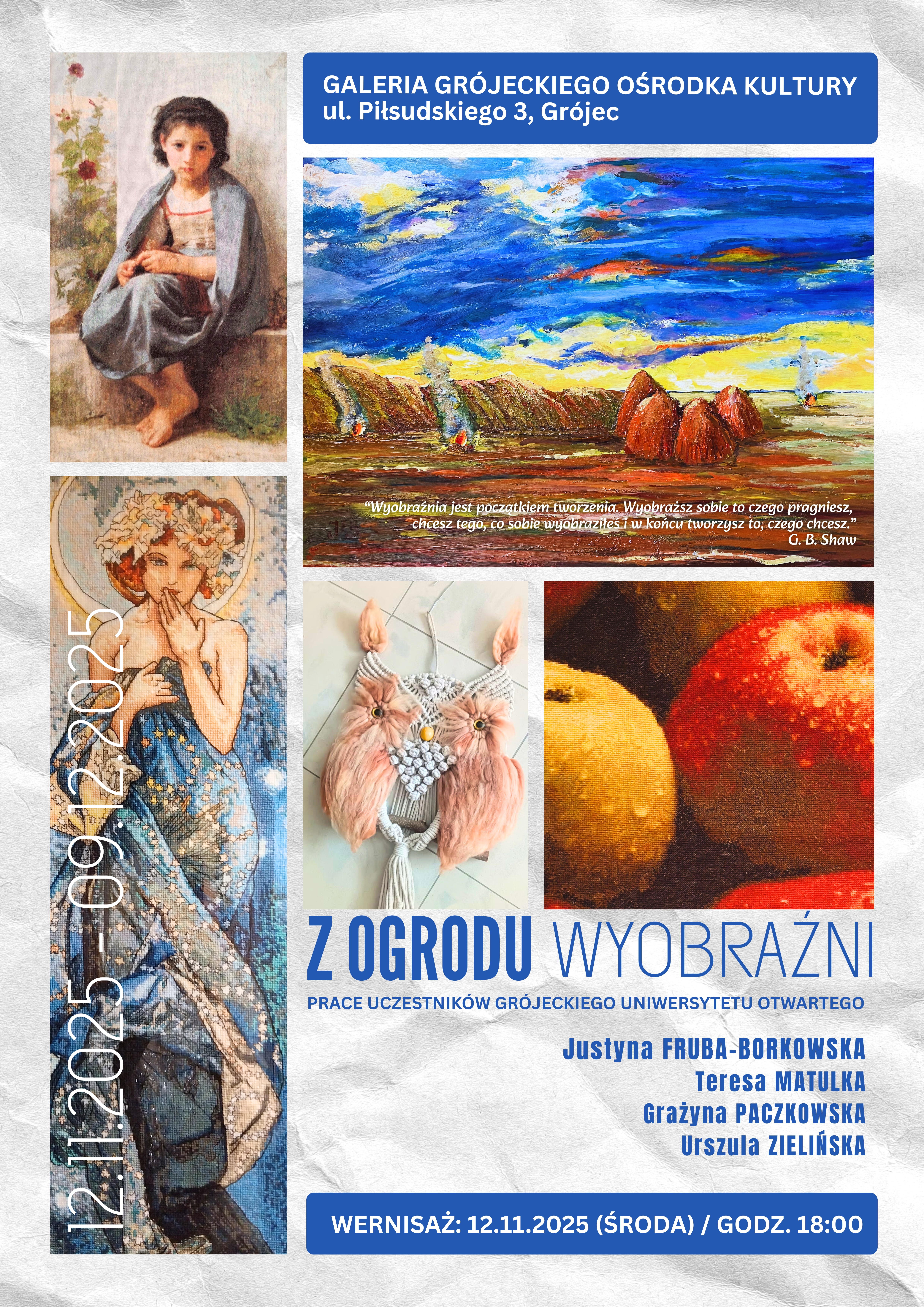 Zapraszamy serdecznie na wyjątkowy wernisaż wystawy „Z Ogrodu Wyobraźni”, prezentującej twórczość utalentowanych uczestników Grójeckiego Uniwersytetu Otwartego! To magiczne spotkanie ze sztuką, gdzie poznacie prace z różnych technik – od malarstwa, poprzez hafty, aż po makramy – które powstały dzięki pasji i nieograniczonej wyobraźni lokalnych artystów.
