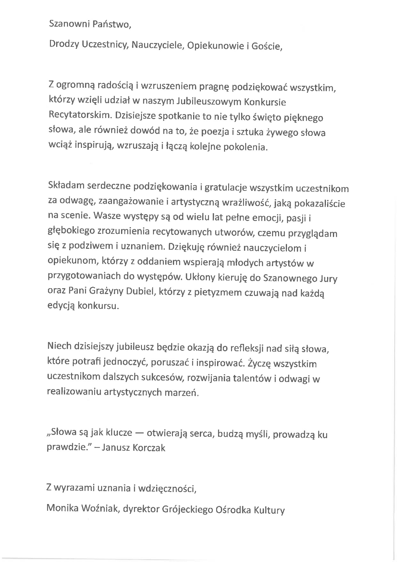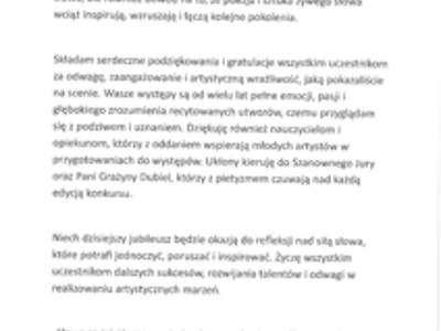 Przedstawiciele placówek oświatowych z gminy Grójec otrzymali z rąk Pani Przewodniczącej podziękowania za wieloletnią współpracę przy okazji organizacji konkursu. Odczytany został także list adresowany do uczestników, nauczycieli opiekunów oraz gości, który wystosowała nieobecna tego dnia Pani Monika Woźniak, dyrektor Grójeckiego Ośrodka Kultury. Serdecznie gratulujemy wszystkim uczestnikom i laureatom! Dziękujemy za piękne chwile z polską poezją i zapraszamy do udziału w kolejnych wydarzeniach organizowanych przez Grójecki Ośrodek Kultury!