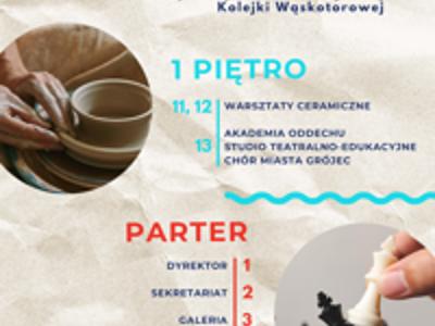 - lokalne centrum kultury z pracownią artystyczną, zapleczem administracyjnym i sanitarnym – usytuowane na parterze i pierwszym piętrze wyższej części budynku,
