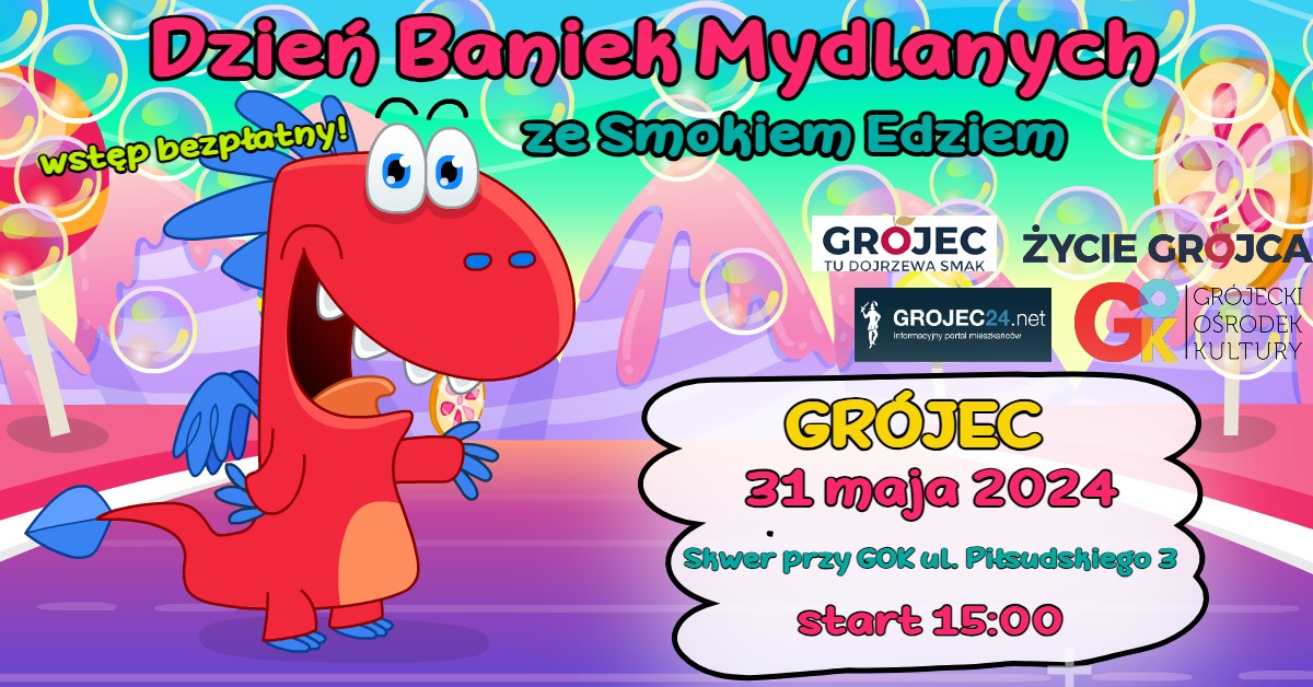 Już 31 maja przy skwerze GOK odbędzie się Dzień Baniek Mydlanych ze Smokiem Edziem. Do naszej trasy dołączył ulubieniec dzieci z kanału Youtube, z którym będzie można się spotkać, przytulić, poprosić o autograf.